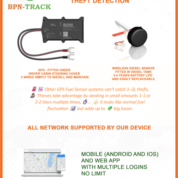 Most fuel theft detection devices from other brands can only detect thefts of at least 5โ10 liters at a time. Thieves exploit this limitation by repeatedly stealing small amountsโjust 1โ2 litersโat different locations and intervals. Because these devices cannot track such minor losses, thieves can continue undetected, ultimately defeating the purpose of the entire system. Unlike BPN-TRACK, other companies that attempted to detect thefts as small as 1โ2 liters failed due to frequent false alerts, these false alarms were triggered by natural fuel movement (sloshing) in the tank, especially during transit on hilly terrain or rough roads or fibre tanks, these all differences makes BPN-TRACK the game changer with its accurate and reliable results.